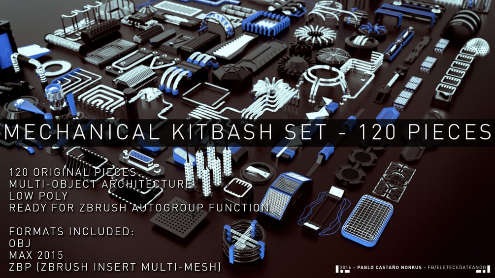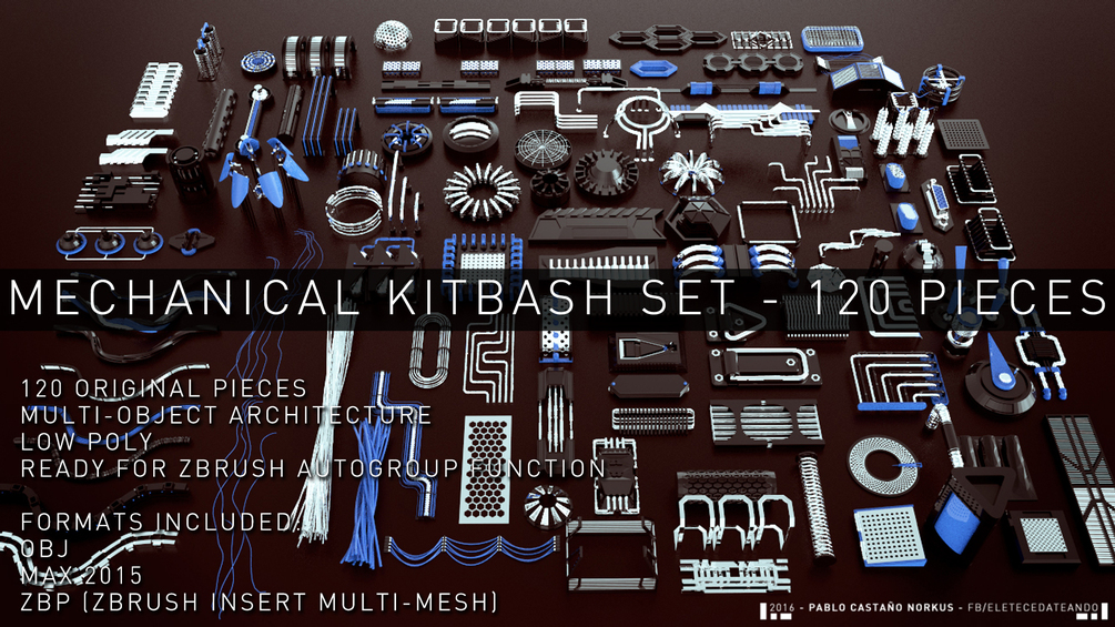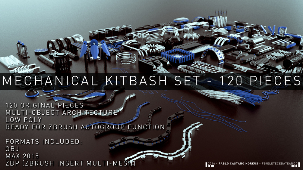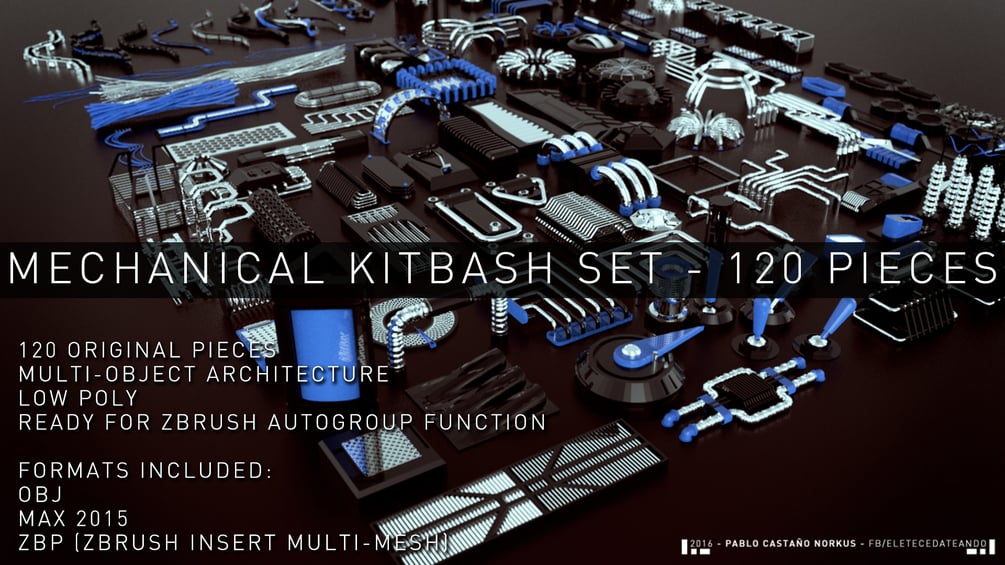 MECHANICAL KITBASH Set is composed by 120 original pieces for kitbashing your models on ZBRUSH, 3DS MAX or ANY 3D Package. Open the Max file, import the OBJ; FBX or paste the .ZBP file into your startup/brushpresets folder, start ZBRUSH and enjoy!. All the models are lowpoly so you can use it without slowing your machine. Each Piece have multiple sub-objects define so you can break them in multiple subtools!!! Be creative and HAVE FUN with this exclusive ZBRUSH KITBASH SET.