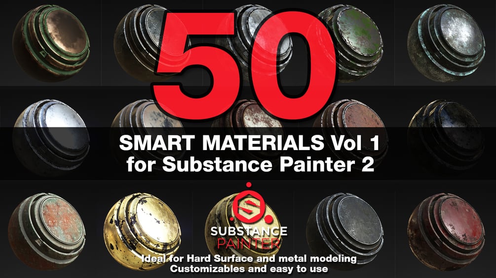 Substance Painter Smart Materials Vol 1 contains 50 original Materials made in Allegorithmic Substance Painter 2. Ideal for Hard Surface modeling!!!. This package include the following materials: